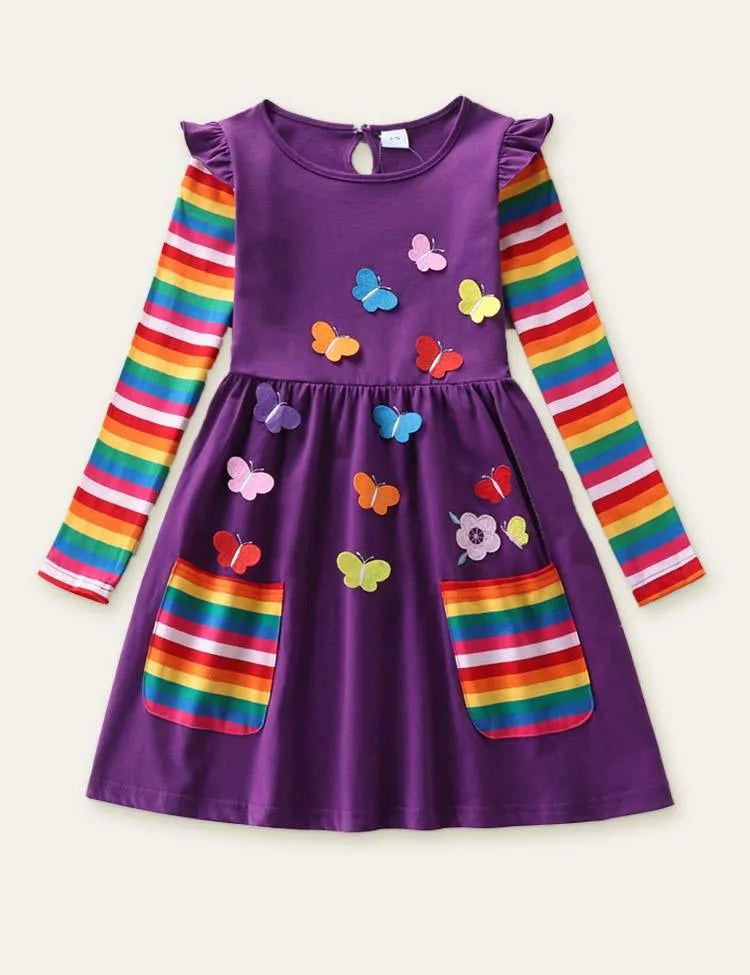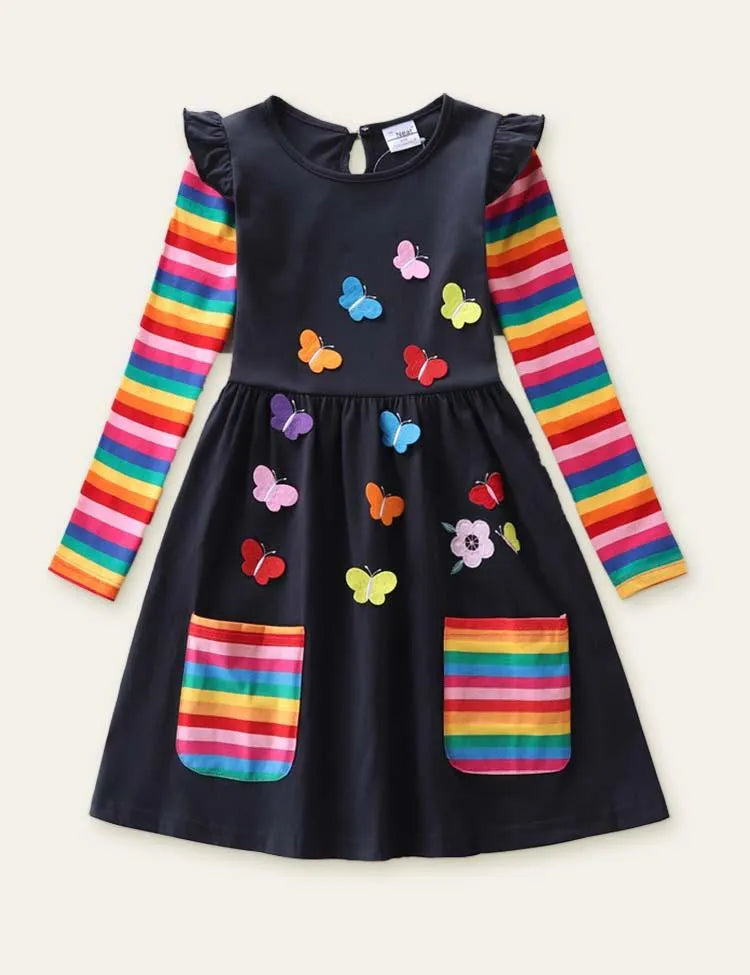 Flower Butterfly Appliqué Rainbow Long Sleeve Dress
